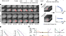 Mice use tactile feedback to re-aim licks. Side and bottom views of the mouse tongue for L1–L5 at full speed and slowed 1/40×, for left, centre and right spout displacement trials. Left to right, raw video, video with tongue labelled by a convolutional neural network (pink; yellow, tongue tip; red, contact centroid) and the estimated tongue tip trajectory and nick location for L1–L5. Lick phases are protrusion (green), corrective sub-movement (orange), spout contact sub-movement (yellow) and retraction (purple).