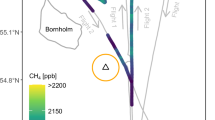 The seawater column near the northernmost leaks was sampled for dissolved CH4 concentrations and stable carbon isotopic signatures between 3 and 5 October 2022 using conductivity, temperature and depth (CTD) casts deployed from the RV Skagerak10 (Figs. 1 and 2, and Supplementary Method 3). Subsea plume simulations, corroborated by fossil CH4 isotopic signatures, suggest that 9% of dissolved CH4 from the ruptured pipelines was transported by currents to 16 of 20 sampling sites. Using the average and maximum dissolved CH4 concentration measured across sampling sites, the amount of dissolved CH4 was extrapolated to be 10 kt and 55 kt, respectively10. In our analysis, we consider the 10-kt estimate to be more credible because maximum dissolved CH4 concentrations did not persist over all sampling locations. Atmospheric CH4 concentrations were also measured onboard RV Skagerak near several CTD sampling sites using a Picarro G2132-i laser spectrometer10. Estimated sea-surface CH4 outgassing rates ranged from 0.5 × 10−3 t h−1 km−2 and 5 × 10−3 t h−1 km−2. Although providing further evidence of outgassing, these rates have not been spatially modelled beyond the extent of CTD sampling sites to other regions shown to have undergone outgassing9,11, thus limiting their ability to inform gross outgassing rates over the Baltic Sea.