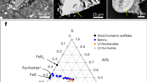 The Bennu samples contain an array of phases formed by precipitation from a fluid. The most abundant of these phases include sulfides, magnetite and carbonates (10, 5 and 3 vol.%, respectively, by X-ray diffraction of a bulk sample5), although concentrations differ between individual millimetre-sized asteroidal particles. These phases often occur in association. Sulfides, primarily pyrrhotite, occur as pseudohexagonal mineral grains tens to hundreds of microns in size, micron-size anhedral grains5 and vug-filling laths, the last of these being associated with magnesian phyllosilicates and apatite5 (Extended Data Fig. 1a). Carbonate includes grains of calcite (CaCO3), dolomite ((Mg,Ca)CO3) and Fe,Mn-bearing magnesite (MgCO3). Using scanning electron microscopy (SEM), we observed subhedral to rounded calcite occurring with magnetite (Fe3O4), the latter as framboids (Fig. 1a), plaquettes and spherules. These phases also appear separately. Calcite occurs as ovoid shapes with aspect ratio of roughly 2:3 (Extended Data Fig. 1b), and magnetite framboids occur in veins. SEM and electron microprobe analysis (EMPA) show that the calcite has near-end member composition (4 mol.% or less MgCO3 and FeCO3; 0.1 mol.% or less MnCO3; Extended Data Fig. 2).