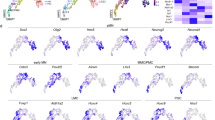 Fastq files were aligned to the mm10 genome assembly and barcodes were counted using CellRanger ARC (v.2.0.2)82. Expression counts and chromatin peak matrices generated from CellRanger were further processed using the Signac R package83. The snATAC–seq dataset included a median of 31,000 reads and 14,200 high-quality fragments per cell, while the snRNA-seq dataset comprised a median of 68,000 unique molecular identifiers (UMIs) and 4,300 genes detected per cell. Low-quality nuclei were filtered out using standard Signac parameters and MACS2 was used for peak calling84. Transcriptome data were normalized and dimensionality was reduced using PCA (Seurat). DNA accessibility data were normalized using latent semantic indexing (Seurat). From the combined Seurat object, UMAP and nearest-neighbour analyses were performed to identify clusters with a resolution of 1 across 20 dimensions, as indicated by the ElbowPlot function, and based on their chromatin and gene expression profiles. Cell identities for the resulting 16 clusters were assigned using well-known marker genes from the literature and past scRNA-seq datasets85 (Extended Data Fig. 1 and Supplementary Table 2).