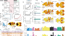 To illustrate our main results, we plotted them into a flatmap of the brain30 (Fig. 2c). The Extended Data figures present some of the results on more conventional two-dimensional (2D) sections (which are detailed in Extended Data Fig. 1). For reference, the average activity across all regions aligned to the major task events—stimulus onset, first wheel-movement time and feedback—is shown in Supplementary Fig. 1. To visualize continuous temporal dynamics across different task epochs, that figure also shows time-warped average activity, which was simultaneously aligned to stimulus, movement and feedback onsets.