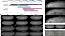 For dsRNA injections in D. melanogaster, 0–1 h-old (up to stage 2) embryos were collected, dechorionated with bleach and mounted on an agar pad. The mounted embryos were then picked up using a coverslip painted with glue (prepared by immersing bits of Scotch tape in heptane), desiccated for 10–14 min using Drierite (W. A. Hammond Drierite Co.) and covered with a mixture of Halocarbon oil 700 and 27 (Sigma-Aldrich) at a ratio of 3:1. Needles for injection were prepared from micro-capillaries (Drummond Microcaps, outer diameter 0.97 mm, inner diameter 0.7 mm) pulled with a Sutter P-97/IVF and bevelled with a Narishige pipette beveller (EG-44). Injections were performed on a Zeiss Axio Observer D1 inverted microscope using a Narishige manipulator (MO-202U) and microinjector (IM300). A volume of ~144 pl of solution with a concentration of 1.1–1.6 μg μl−1 or 8–12 μg μl−1 dsRNA was injected into the embryo. Embryos were kept at 25 °C after injection in a moist chamber until early to mid-cellularization, followed by live imaging.