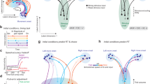 Single-trial trajectories, in sum, filled out the two-dimensional latent space inferred by FINDR. But when averaged over trials of a given evidence strength (Fig. 2h), they evolved along a one-dimensional curved trajectory. Looking exclusively along this one-dimensional manifold, the dynamics resemble those of the bistable attractor hypothesis1 (Fig. 1f) in the sense of a one-dimensional unstable point at the origin, with autonomous dynamics growing stronger the farther the system is from the origin. However, the bistable attractor hypothesis and the other two hypotheses in Fig. 1g,h posit a one-dimensional manifold of slow autonomous dynamics, along which evidence accumulation evolves and towards which other states are attracted1,23. By contrast, the FINDR-inferred dynamics (which are inferred from single trials, not averaged trials) suggest an initial two-dimensional manifold of slow autonomous dynamics. Sensory evidence inputs drive evidence accumulation along one of these slow dimensions. The other slow dimension corresponds to the decision commitment axis, along which autonomous dynamics will become dominant later in the process. We wondered why there would be slow autonomous dynamics along this second dimension. We speculate that, during initial evidence accumulation, slow autonomous dynamics along the decision commitment axis provide a mechanism for inputs driven by non-sensory factors such as trial history49 to influence choice independent of the accumulating sensory evidence.
