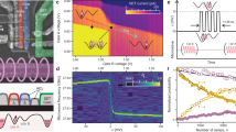 We operated the devices in a 3He/4He dilution refrigerator with a base temperature of 10 mK in isolated mode, with four electrons in the double dot formed under the plunger gate electrodes (P1 and P2). A voltage applied to an interstitial exchange gate (J) controlled the tunnel coupling between the dots1,35,36. The electrons were loaded from a two-dimensional electron gas formed under the reservoir gate, which overlaps with an n++ implanted ohmic region. The Pauli spin blockade at the (3,1)–(4,0) charge transition was used for spin parity read-out and the signal was measured using the SET in d.c. mode (Fig. 1b). SET charge-noise measurements reveal a 1/fα power spectral density with α between 0.50(7) and 1.19(5) and an amplitude of 0.79(4)–\(0.98(7)\,{\rm{\mu }}{\rm{eV}}/\sqrt{{\rm{Hz}}}\) at 1 Hz (Extended Data Fig. 1), in line with previous low charge-noise results from devices fabricated using similar methods19,21.