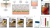 The field of engineered living materials (ELMs) uses the tools of synthetic biology to reprogram living cells at the DNA level to build new or enhanced biomaterials for specific applications7,8. Bacterial cellulose (BC) is a promising natural biomaterial, produced most effectively by bacteria in the Gram-negative genus Komagataeibacter9. In carbon-rich media, these bacteria polymerize and secrete linear chains of glucose. These chains then self-assemble into a dense interconnected mesh of cellulose fibers. This cellulose mesh, called a pellicle, floats at the air–water interface and envelops and protects the growing cells, like a biofilm10. Key to the industrial interest in BC, it can be grown quickly, cheaply and sustainably—a BC pellicle can be grown in 7–14 days, in high yields (>10 g l−1) and from waste feedstocks, such as rotten fruit juice, glycerol and molasses11,12,13. Additionally, BC has advanced material properties such as high tensile strength, high water-holding capacity and high purity14,15. These features have led to interest in using BC in high-end acoustic devices, as a battery separator membrane and in wound healing16,17,18,19,20,21. The ease of growing BC has also led to BC becoming an attractive prototype biomaterial for some in design and fashion who seek to speculate on methods of sustainable textile production22. The production of BC by culturable, low-risk bacteria also makes BC accessible to those seeking to modify it genetically using synthetic biology. Therefore, BC represents an ideal ‘blank slate’ for ELM research.