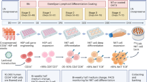 At stage 3, cells collected from the stage 2 were cultured in the StemSpan SFEM II Medium supplemented with StemSpan Lymphoid Progenitor Maturation Supplement, CD3/CD28/CD2 T Cell Activator and 20 ng ml−1 human recombinant IL-15 for 1 week. Cells were resuspended at 5 × 105 cells per ml; 2 ml cell suspension was added into Non-Treated Falcon Polystyrene six-well Microplates (Thermo Fisher Scientific) precoated with 1 ml per well of StemSpan Lymphoid Differentiation Coating Material. Cells were passaged 2–3 times per week to maintain a cell density at 0.5–1 × 106 cells per ml; fresh medium was added at every passage.