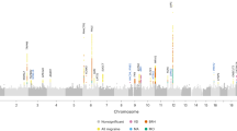 We estimated both the SNP heritability (\(h_{\mathrm{SNP}}^2\)) of migraine and pairwise genetic correlations (rG) between each pair of study collections using LDSC v.1.0.0 (refs. 30,35). SNP heritability and genetic correlations were estimated using European LD scores from the 1000 Genomes Project Phase 3 data for the HapMap3 SNPs, downloaded from https://data.broadinstitute.org/alkesgroup/LDSCORE/. We reformatted the meta-analysis association statistics to LDSC format with munge-tool, which excluded variants that did not match with the HapMap3 SNPs, had strand ambiguity (that is, A/T or G/C SNPs), MAF <0.01 or missingness more than two-thirds of the 90th percentile of the total sample size, or resided in long-range LD regions97, in centromere regions or in the major histocompatibility locus (MHC) of chromosome 6, leaving 1,165,201 SNPs for the LDSC analyses. We used a migraine population prevalence of 16% and a sample proportion of cases of 11.7% = 102,084/(102,084 + 771,257) to turn the LDSC slope into the estimate of \(h_{\mathrm{SNP}}^2\) on the liability scale98. Pairwise genetic correlation results are listed in Supplementary Table 2. We note that in the previous migraine meta-analysis13, LDSC reported \(h_{\mathrm{SNP}}^2\) value of 14.6% (13.8–15.5%), which was considerably larger than the value 11.2% (10.8–11.6%) that we report in our analysis. When we ran our LDSC pipeline on the data of Gormley et al.13, we estimated \(h_{\mathrm{SNP}}^2\) value of 10.6% (10.1–11.1%). Thus, it seems that our liability transformation estimates lower values of heritability than the transformation used by Gormley et al.13.