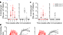 The participant with the lowest RBD-specific IgG and IgA levels contracted COVID-19 8 weeks after the second vaccination (Extended Data Fig. 6a–d). While this participant produced high-affinity neutralizing B cells (Fig. 4f,g), antibody levels were not protective. In addition, the participant’s antibody levels did not increase by day 120, 2 weeks after COVID-19 infection (Extended Data Fig. 6a–c), suggesting that the low antibody levels were not due to the effectiveness of the mRNA vaccine.