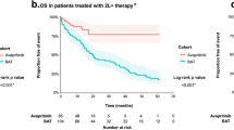 OS, PFS and DOR were determined by Kaplan–Meier estimates, and 95% CIs were estimated using Greenwood’s formula41. Comparisons between two Kaplan–Meier functions was performed using a log-rank test.
