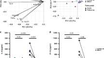 We hypothesized that the differences in soluble biomarker levels detected at early and later time points during the course of MIS-C (Fig. 2a and Extended Data Fig. 2b) could be due to early intervention with systemic glucocorticoids and IVIG17. However, how these interventions modulate the inflammatory response has not been elucidated. The timeline of initiation of therapeutic intervention with various classes of drugs and blood sampling compared to day of admission in patients with MIS-C is reported in Extended Data Fig. 3. We identified 12 patients for whom biomarker levels were measured both before (median, 0 day; IQR, −1 to 0 days) and after (median, +5 days; IQR, +4 to +7.5 days) glucocorticoid administration. Two of these patients had previously received IVIG, and eight additional patients received IVIG in the interval. Biomarkers associated with type II IFN response (IFN-γ and CXCL9), T cell activation (sCD25), cell adhesion (sE-Selectin/sCD62E) and monocyte/macrophage activation (sTNFRII, M-CSF, ferritin and IL-6) decreased after treatment (Extended Data Fig. 4a). To investigate how rapidly treatment with glucocorticoids and/or IVIG might impact on the inflammatory phenotype, we re-analyzed the MIS-C Early cohort, segregating patients into two groups: those whose blood samples were drawn before (n = 12) or after (n = 36) therapeutic intervention. A significant difference of blood levels between untreated and pre-treated patients with MIS-C Early was observed for four biomarkers (lymphotoxin-α (LT-α), lactoferrin, IL-12p70 and IL-5), and a similar trend was present for several other proteins (Extended Data Fig. 4b). Furthermore, treatment before blood sampling was not among the top ten most important variables when introduced in the random forest regression analysis comparing MIS-C Early versus pHC (Extended Data Fig. 4c). Altogether, these data indicate that treatment did not entirely obscure the hyperinflammatory phenotype that characterizes MIS-C early in the course of the disease. However, longitudinal analysis during the entire course of hospitalization revealed a negative correlation between length of hospitalization and levels of most soluble biomarkers in patients who had received glucocorticoids, irrespective of whether IVIG was administered (Supplementary Fig. 2a,b). Random forest regression analysis identified several biomarkers that were of higher median predictive importance in patients who received glucocorticoids (Fig. 3g); concurrent use of IVIG had a more specific effect on IL-1R antagonist (IL-1Ra), MPO, sIL-2Rα, sTNFRI, LBP, sICAM-1, CCL3 and sCD163.