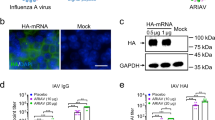 MDCK cells transfected with 1 M LNA9 or Scr. LNA were infected with PR8 virus at an MOI of 0.1 24 h post-transfection. Then 8 h post-infection total cellular RNA was extracted in TRIzol reagent (Invitrogen) and the RNA was purified using the Direct-Zol RNA mini-prep (Zymo Research) according to the manufacturer’s protocol. RT and qPCR were performed according to the literature43. Complementary DNAs of the influenza vRNA and complementary viral RNA (cRNA) were synthesized with tagged primers to add an 18- to 20-nt tag that was unrelated to the influenza virus at the 5′-end (cRNAtag: 5′-GCT AGC TTC AGC TAG GCA TC-3′; vRNAtag: 5′-GGC CGT CAT GGT GGC GAA T-3′). Hot-start RT with the tagged primer was performed as described in Kawakami et al.43 using saturated trehalose. A 5.5-μl mixture containing 200 ng of total RNA sample and 10 pmol of tagged primer was heated for 10 min at 65 °C, chilled immediately on ice for 5 min and then heated again at 60 °C. After 5 min, 14.5 μl of preheated reaction mixture (4 μl of First Strand buffer (5×, Invitrogen), 1 μl of 0.1 M dithiothreitol, 1 μl of dNTP mix (10 mM each), 1 μl of Superscript III reverse transcriptase (200 U μl−1, Invitrogen), 1 μl of RNasin Plus RNase inhibitor (40 U μl−1, Promega) and 6.5 μl of saturated trehalose) was added and incubated for 1 h. RT–qPCR was performed with PowerUp SYBR Green SuperMix (Applied Biosystems) on a BioRad CFX96 Real-Time System. Then 7 µl of a tenfold dilution of the cDNA was added to the qPCR reaction mixture (10 μl of SYBR Green SuperMix (2×), 1.5 μl of forward primer (10 μM) and 1.5 μl of reverse primer (10 μM)). The cycle conditions of qPCR were 95 °C for 10 min, followed by 40 cycles of 95 °C for 15 s and 60 °C for 1 min. The qPCR primers were: PR8 segment 1 (PB2) cRNA: forward: 5′-TCC ACC AAA GCA AAG TAG AAT GC-3′; reverse: 5′-GCT AGC TTC AGC TAG GCA TCA GTA GAA ACA AGG TCG TTT TTA AAC-3′; PR8 segment 1 (PB2) vRNA: forward: 5′-GGC CGT CAT GGT GGC GAA TAG ACG AAC AGT CGA TTG CCG AAG C-3′, reverse: 5′-AGT ACT CAT CTA CAC CCA TTT TGC-3′; PR8 segment 4 (HA) cRNA: forward: 5′-CTG TAT GAG AAA GTA AAA AGC C-3′, reverse: 5′-GCT AGC TTC AGC TAG GCA TCA GTA GAA ACA AGG GTG TTT TTC-3′; and PR8 segment 4 (HA) vRNA: forward: 5′-GGC CGT CAT GGT GGC GAA TAG GAT GAA CTA TTA CTG GAC CTT GC-3′, reverse: 5′-TCC TGT AAC CAT CCT CAA TTT GGC-3′.