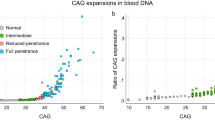 HD is an autosomal dominant disorder and is caused by an expanded CAG repeat ≥40 in the huntingtin gene (HTT) coding for polyglutamine in the mutant huntingtin protein (mHTT), which is the presumed toxic entity leading to neuronal dysfunction and death. It is well established that inherited CAG repeat length has a strong influence on age at clinical motor diagnosis3. Notably, the HTT repeat is somatically unstable4 and expansion of tens or even hundreds of repeats are observed in the most vulnerable striatal neurons5,6,7,8; greater somatic expansion occurs with longer initial CAG length. Evidence indicating that faster individual-specific rates of somatic expansion in brain are associated with earlier clinical motor diagnosis and faster disease progression9 strongly suggests that somatic expansion is a key mechanism explaining the CAG effect on disease progression. Indeed, it has been suggested that somatic expansion is required to generate pathology, and that HD involves two thresholds as follows: first, the inherited CAG length that leads to further somatic expansion, and second, the intracellular pathogenic threshold above which neuronal dysfunction and death occur10,11,12,13. Consistent with this, a recent postmortem study suggests that neurons may experience decades of ‘biologically quiet’ somatic CAG repeat expansion with neuronal damage triggered by a cascade of repeat-length dependent transcriptional dysregulation events only when the CAG reaches a threshold of ~150 repeats8. Further understanding the dynamics of somatic expansion directly in the brain is hampered by the nonavailability of brain biopsy material from young living participants. Although somatic CAG expansion is clearly cell-type dependent6,7,8, faster individual-specific rates of somatic expansion in blood DNA are also associated with earlier clinical motor diagnosis14, suggesting that individual-specific somatic expansion rates in blood DNA are at least partially predictive of individual-specific somatic expansion rates in the brain. This hypothesis is supported by genetic modifier studies that reveal a panoply of DNA repair gene variants as modifiers of both HTT somatic expansion and HD clinical phenotypes13,14,15,16,17.
