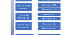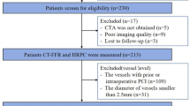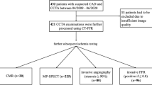 Descriptive data continuous variables are reported as mean (± standard deviation) or median (IQR) and categorical as number (%). Comparisons were performed using Student’s t-test, Mann–Whitney test or chi-square test where appropriate. Time to first event was calculated using Kaplan–Meier methodology from the time of the CCTA until 2 years. Cox-proportional regression was used to determine the univariable HR of clinical outcomes at 2 years after CCTA41,42,43. Prognostic covariates that were different between the groups at entry into the study were entered into an adjusted multivariable Cox regression model41,44. Additional multivariable sensitivity analysis were performed using the differences in baseline characteristics with the inclusion of FFR-CT availability as an interaction term for predicting ICA. Age was recalculated as mean-centered age for the interaction term to reduce multicollinearity. PSM was performed for the primary outcomes to help determine causal effect. The PSM model used a 1:1 nearest-neighbor method, with assessment of post-match covariate by standardized mean difference. A standardized mean difference of <5% was used for the matching. Matched-pairs analysis was performed using Cox-proportional hazard models stratified on the matched pairs. The 95% confidence intervals (CIs) are reported with P values, and a two-sided P value <0.05 was considered statistically significant. All statistical analysis was performed in the R stats package (R documentation, version 3.6.2).