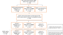 HER3 staining was centrally performed on 72 samples by Roche CDx CAP/CLIA Laboratory (Tucson) using clone SP438 and scored as follows: membrane H-score: 0–300; cytoplasm H-score: 0–300; overall membrane positivity at ×10 magnification: 0–100. Overall, 4 samples at baseline were not available (not provided by the participating centers) and 23 samples were excluded from the analysis due to tumor cellularity <10%. Centralized HER2 assessment on tumor biopsies at BL was performed by a GEFPICS (Groupe d’Etude des Facteurs Pronostiques par Immunohistochimie dans le Cancer du Sein)-trained pathologist using the Roche HER2 (4B5) clone and scored according to the last version of the American Society of Clinical Oncology (ASCO) and College of American Pathologists (CAP) guidelines39. ‘Ultralow’ HER2 category was defined as cases showing a faint-to-weak, incomplete membrane staining in <10% of tumor cells (classified in the IHC 0 category following the ASCO and CAP guidelines). A total of 69 samples was available for centralized HER2 assessment, because 4 samples were not provided and the remaining 26 had insufficient tumor tissue for further analysis.
