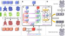 Cluster 3 metrics (Fig. 4c, bottom row) share a different overall trend: score values are substantially lower for ADH relative to APOF map targets. These measures include three unmasked correlation functions from TEMPy16,17,18, Refmac FSCavg13, Electron Microscopy Data Bank (EMDB) Atom Inclusion14 and TEMPy ENV16. All of these measures consider the full experimental map without masking, so can be sensitive to background noise, which is substantial in the unmasked ADH map and minimal in the masked APOF maps (Fig. 2d).