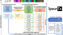 All sc/snRNA-seq datasets were analyzed using the scanpy package45. All data were preprocessed via the following steps: we removed cells with high mitochondrial gene content and normalized the data to correct for library size. The resulting snRNA-seq data were ready to be mapped with Tangram. To compute marker genes, we applied a computational pipeline described in the tutorial of the scanpy package46 (https://scanpy-tutorials.readthedocs.io/en/latest/pbmc3k.html). Briefly, we applied the function \(f\left( x \right) = {{{\mathrm{log}}}}(1 + x)\) to the normalized counts, and standardized gene expression. Next, we performed principal components analysis and retained the first 50 principal components of the gene expression matrix and computed a k-nearest neighbor (k-NN) graph using the Euclidean distance in expression space. All cell types in the sc/snRNA-seq data were preannotated, and we verified via a UMAP plot showing that cells with the pre-existing annotations form distinct clusters in transcriptome space (results shown for MOp snRNA-seq in mouse; Extended Data Fig. 7a). We then identified differentially expressed marker genes by a statistical t-test (the top two genes for each cell type for the MOp snRNA-seq in mouse are shown in Extended Data Fig. 7b). In mapping onto spatial transcriptomic data, we chose the top 100 marker genes for each cell type, which overall sums up to ~1,000 genes. We chose not to map using the entire transcriptome, as several genes in Visium data are not high quality (for example, because of dropouts), and it would not be beneficial to add those genes to the training set. Also, by leaving out a large part of the transcriptome, we have a convenient test set of genes. Finally, nonmarker genes fluctuate in their basal signal and would not contribute to mapping.