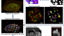 Organoid segmentation was performed with the Otsu method48 using the mean intensity of all channels. Before segmentation, we enhanced contrast for all z slices by applying contrast limited adaptive histogram equalization49 preceded by image normalization. The contrast-enhanced images were then smoothed using a 3D Gaussian filter. The auto-Otsu threshold was calculated using the stack histogram and the final threshold can be adjusted using a scale factor, which was set at 0.8, by default (that is, final_threshold = scale_factor × auto_otsu_threshold). After thresholding, small elements were automatically filtered from the mask, to retain only the largest one in case of out-of-organoid debris or cells. To generate a smooth 3D mask, we conducted a series of mathematical morphological operations on a slice-by-slice basis, that is, dilation with a disk structure element followed by hole filling and erosion with a disk structure element.