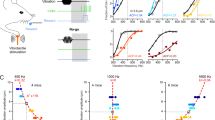 a, Hit and False alarm lick rates for Ush2a+/+ and b, Ush2a-/- mice during training. Ush2a+/+ and Ush2a-/- mice learned to report 5Hz 60mN forepaw vibration after 4 days (Hit vs False lick rates within each genotype: ***P < 0.001; two-way repeated-measures ANOVA with Bonferroni post-hoc analysis. Ush2a+/+: F(6,60) = 4.486, P=0.006. Ush2a-/-: F(6,48) = 3.698,P=0.004). Light colour lines indicate individual mice, bold lines population mean. c, Perceptual sensitivity (d’) measurements indicate increasing sensitivity during training in both Ush2a+/+ and Ush2a-/- mice. Plot shows max and min values, box shows 1st, 2nd (median) and 3rd quartile values. d, Perceptual thresholds of Ush2a+/+ mice to 5Hz stimuli. Ush2a+/+ mice reported 5Hz stimuli ≥12mN, as shown by significantly higher Hit vs False Alarm lick rates ≥12mN (Hit vs False: Two-way repeated measures ANOVA F(5,30) = 16.52, P=0.0005, asterisk indicates Bonferroni post-hoc analyses ***P < 0.001. e, Ush2a-/- mice reported 5Hz vibration stimuli ≥24mN (Hit vs False: two-way repeated-measures ANOVA F(6,24) = 16.52, P<0.0001, asterisk indicates Bonferroni post-hoc analyses ***P < 0.001. f, Mean first lick latencies during hit trials of Ush2a-/- mice were longer at 36mN 5Hz vibration; Two-way repeated-measures ANOVA F(6,63) = 2.306, P=0.045 asterisk indicates Bonferroni post-hoc analysis *P < 0.05. g, Hit and False licking rates during 25Hz vibration detection task in Ush2a+/+ and Ush2a-/- mice. Dots show data from individual mice, horizontal lines show mean. h, Hit and False licking rates of mice during 100Hz vibration detection task in Ush2a+/+ and Ush2a-/- mice. i, Mice trained on the vibration detection did not respond to any sound generated by the vibration stimulus when the Piezo device placed 5mm below the forepaw (paired two-tailed t-tests, Ush2a+/+ P=0.97; Ush2a-/- P=0.17). Data = mean ± s.e.m. n = 11 mice. Filled dot shows hit rates, open dot shows false alarm lick rates.