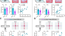 a, Schematics of the Elevated Plus Maze (left) and Open Field (right) apparatus. b, Quantification of total time spent in the inner (GFP: 15.67 ± 5.97 s (baseline), 14.18 ± 7.24 s (stim), 18.07 ± 6.38 s (post); ChR2: 22.59 ± 4.92 s (baseline), 35.90 ± 10.22 s (stim), 29.73 ± 6.49 s (post); eArch: 5.69 ± 2.32 s (baseline), 11.01 ± 6.61 s (stim), 8.54 ± 5.20 s (post)) and outer perimeter (GFP: 284.32 ± 6.01 s (baseline), 285.70 ± 7.25 s (stim), 281.80 ± 6.39 s (post); ChR2: 277.31 ± 4.92 s (baseline), 264.00 ± 10.22 s (stim), 270.17 ± 6.47 s (post); eArch: 294.31 ± 2.32 s (baseline), 288.99 ± 6.61 s (stim), 291.46 ± 5.20 s (post)) of the Open Field Test (control, n = 8 animals, ChR2, n = 8 animals, eArch, n = 6 animals; two-way repeated measures ANOVA; P-value was above 0.05, no significance; F4,42 = 0.8743 (inner), F4,42 = 0.8633 (outer)). Data are mean ± s.e.m. c, Quantification of total distance travelled (GFP: 4.27 ± 0.73 m (baseline), 4.36 ± 0.72 m (stim), 3.36 ± 0.51 m (post); ChR2: 6.92 ± 0.87 m (baseline), 5.91 ± 0.88 m (stim), 5.85 ± 0.95 m (post); eArch: 4.59 ± 0.56 m (baseline), 5.45 ± 0.99 m (stim), 3.91 ± 0.59 m (post)), and d, total time spent in the open (GFP: 38.53 ± 12.26 s (baseline), 19.19 ± 6.65 s (stim), 11.03 ± 3.44 s (post); ChR2: 28.61 ± 9.69 s (baseline), 21.21 ± 6.31 s (stim), 27.91 ± 5.76 s (post); eArch (24.33 ± 4.70 s (baseline), 24.85 ± 4.98 s (stim), 14.35 ± 6.56 s (post)) and closed arms (GFP: 239.16 ± 17.28 s (baseline), 270.86 ± 8.54 s (stim), 280.76 ± 4.61 s (post); ChR2: 248.58 ± 11.66 s (baseline), 258.80 ± 9.36 s (stim), 261.08 ± 7.60 s (post); eArch (261.22 ± 4.07 s (baseline), 264.45 ± 5.50 s (stim), 272.48 ± 10.19 s (post)) of the Elevated Plus Maze (control, n = 8 animals, ChR2, n = 8 animals, eArch, n = 8 animals; two-way repeated measures ANOVA; P-value was above 0.05, no significance; F4,38 = 1.083 (distance), F4,38 = 1.402 (open arms), F4,38 = 1.355 (closed arms)). Data are mean ± s.e.m. e, Power spectrum of EEG signals in the frontal and parietal cortex. Left, laser on, right, laser off. f, Overlap of power spectrum of EEG signals in the frontal and parietal cortex from e. The mean spectrum in each condition was calculated from the average across 9 sessions (n = 3 mice, 2 min laser on / 2 min laser off, 3 repetitions in each mouse). The error bar represents the standard error. The power spectrum was normalized.
