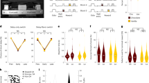 Next, we wanted to confirm that our 20-Hz stimulation of dopamine neurons was effective. To do this, we ran an additional positive control experiment with a new cohort of rats to test whether our 20-Hz stimulation of dopamine neurons can act as a teaching signal to produce learning, as we and others have previously demonstrated3,4,9,16. Here, we used the blocking procedure22. Rats first learned that two light cues lead to two different rewards (Fig. 2, ‘acquisition’; for example, house light → sucrose pellet, flash → grain pellet; counterbalanced). Then, we presented the lights in compound with new auditory cues, which produced the same rewards (for example, Fig. 2, ‘blocking’; house light + white noise → sucrose pellet, flash + click → grain pellets; counterbalanced). Usually, rats do not learn about the new auditory cues, as they are redundant. However, we stimulated dopamine neurons (1 s, 20 Hz) as one of the rewards was delivered. This created a ‘stimulation cue’, which we could compare to our ‘control cue’ that was not paired with stimulation of dopamine neurons. All rats learned to enter the port while the visual cues were presented, which was unaffected by the introduction of the auditory cues or dopamine stimulation (Fig. 2c; time period: F2,16 = 11.072, P = 0.001; session: F5,40 = 1.389, P = 0.249; time period × session: F10,80 = 2.710, P = 0.006; stimulation versus baseline: P = 0.006, control versus baseline: P = 0.003, stimulation versus control: P = 0.140). This demonstrated that all rats learned that the visual cues were predictive of reward and that the stimulation of dopamine neurons did not interfere with the rats’ ability to continue to respond to the food-predictive cues.
