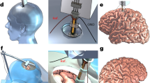 The relative motion of the probe within the brain tissue is a major concern for the stability of neural recordings. Motor tasks represent a challenging set of conditions because movement of the body can place stresses on the implant and move the probe within the brain. With careful preparation, on most sessions we did not observe rapid probe motion due to pulse, respiration or mechanical forces from the motor task. Typically, we observed stable waveforms (Fig. 3h) and ~2–15 µm of slow drift over the course of a recording session (Fig. 3i and Extended Data Figs. 4a and 5). In some isolated cases, when the primate generated a large unexpected movement, we did observe a fast translation of the probe (for example, Extended Data Fig. 4b). However, in practice, we found that low-drift recordings could be obtained across a variety of experimental preparations in disparate brain regions (Fig. 4a–d and Extended Data Figs. 4 and 5).
