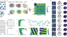 where ‘pr’ is the peak firing rate of the neuron and ‘ReLu’ is a rectified linear unit function. The first model was constrained to have perfect 60° periodicity with axes direction of \(\theta ,\theta +\pi /3,\theta +2\pi /3\), and equal axis periods (\({p}_{0}={p}_{1}={p}_{2}\)). In the second model, the axis directions were free to deviate from 60° periodicity, and the axis periods could differ. The estimated parameters of the first model were used to initialize the second model. The models were fitted using gradient descent, a mean squared error loss function, and an Adam optimizer. We fitted the two models sequentially to minimize the effect of local minima during gradient descent.
