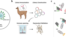 Mammalian, including human, antibodies generally have two chains (heavy and light), but camelids, in addition to two-chain antibodies, also possess a single-heavy-chain antibody variant21. The antigen-specific variable portion of this single-chain antibody is termed the VHH domain and is commonly referred to as a nanobody (Fig. 1c). In addition to compatibility with phage display, nanobodies are small, stable and straightforward to produce21. As a result, they serve as alternates to conventional antibodies as diagnostics, imaging agents and structural biology tools21. The direct application of nanobodies in oncology and inflammatory diseases is being evaluated21,22, with caplacizumab23 approved for use. Nanobodies have been developed against SARS-CoV-1 and are currently being developed against SARS-CoV-224,25, both as research tools and potential therapeutics.