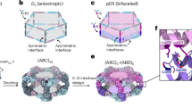 The previously designed pH-dependent trimer is much smaller than the aperture along the C3 axis of the octahedral nanoparticle (Fig. 1b); hence, filling the C3 axis with the pH-dependent trimer requires extending the backbone such that it makes shape-complementary interactions with the designed tetramer. To enable this, we combined helical fusion29,30 and protein-docking31 approaches into a single design pipeline. We extended the pH-dependent trimer by fusing combinations of helical-repeat-protein building blocks onto each subunit to generate more than 80,000 distinct C3 fusions with helical repeats of variable geometry extending outwards from the C3 axis (Fig. 1b and Methods). The resultant diverse set of C3 building blocks was docked into the three-fold-symmetric pore by aligning both C3 axes and sampling translational and rotational degrees of freedom along this axis31 and varying the lengths of the repeat protein arms (Fig. 1c and Methods). The resulting ‘plugged’ octahedral assemblies (O432) contain 12 IgG1 crystallizable fragment (Fc) domains along the octahedral two-fold axes, six tetramers along the octahedral four-fold axes and eight trimeric plugs along the octahedral three-fold axes (Fig. 1d).