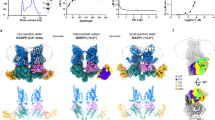 S. pneumoniae NOX was expressed in Escherichia coli and purified as previously described with minor modifications (Methods)4,6. The protein was solubilized using LMNG and showed a single band in SDS–PAGE and a homogeneous single peak on size-exclusion chromatography, corresponding to the monomeric protein (Supplementary Fig. 1a,b). Quick removal of imidazole after Ni-NTA purification was crucial to avoid protein aggregation. The ultraviolet–visible light (UV–vis) spectrum of the purified protein showed the characteristic Soret peak at 414 nm, indicating correct heme incorporation (Supplementary Fig. 1c). Oxidation of NADPH could be directly followed by monitoring absorbance at 340 nm under aerobic conditions. A similar experiment in the absence of O2 showed only initial activity because of residual O2 in the buffer and/or reduction of SpNOX cofactors before the oxidation activity ceased, confirming that O2 can act as an electron acceptor for SpNOX (Supplementary Fig. 1d). NADPH oxidation was also measured with a cytochrome c reduction assay4 (Fig. 1b) and Michaelis–Menten analysis gave an apparent KM value of 7.59 µM and an apparent kcat of 8.27 s−1. The protein also exhibited NADH-driven activity, with an apparent KM value of 3.41 µM and an apparent kcat of 3.33 s−1. Cytochrome c reduction assays under anaerobic conditions revealed direct electron transfer to cytochrome c (Supplementary Fig. 1e), likely from the outer heme, and to superoxide dismutase (SOD) (Supplementary Fig. 1f). Therefore, the rate of cytochrome c reduction by the anion superoxide could not be estimated with SOD inhibition. Our results, obtained under both aerobic and anaerobic conditions, indicate that previous efforts to measure specific superoxide production using SOD inhibition may have been subject to unforeseen artifacts. The initial rates of cytochrome c reduction under aerobic and anaerobic conditions were very similar (Supplementary Fig. 1g), suggesting cytochrome c acts as the major direct electron acceptor in the in vitro assay. Contrary to previous observations4, we could observe ferric reductase activity under anaerobic conditions, indicating direct electron transfer to ferrous iron (Supplementary Fig. 1h). However, the direct transfer rate of SpNOX to ferrous iron (3.6 min−1) was much lower than to cytochrome c (124.7 min−1) or molecular oxygen (48 min−1) at similar initial concentrations. Moreover, Michaelis–Menten analysis of ferric reductase activity showed apparent kcat (0.05 s−1) and KM (81.3 µM) values corresponding to a catalytic efficiency of 0.0006 s−1 µM−1 (Supplementary Fig. 1i). These experiments suggest that the ferric reductase activity of SpNOX might not be physiologically relevant but rather an effect of the promiscuity of SpNOX for the final electron acceptor in vitro.