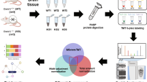 Spectra were converted to mzXML via MSconvert37. Database searching included all entries from the mouse UniProt reference database (downloaded August 2021). The database was concatenated with one composed of all protein sequences for that database in the reversed order. Searches were performed using a 50-ppm precursor ion tolerance for total protein-level profiling. The product ion tolerance was set to 0.03 Da. These wide mass tolerance windows were chosen to maximize sensitivity in conjunction with Comet searches and linear discriminant analysis38,39. TMTpro labels on lysine residues and peptide N termini (+304.207 Da), as well as carbamidomethylation of cysteine residues (+57.021 Da) were set as static modifications, while oxidation of methionine residues (+15.995 Da) was set as a variable modification. Peptide–spectrum matches (PSMs) were adjusted to a 1% false discovery rate40,41. PSM filtering was performed using a linear discriminant analysis, as described previously39 and then assembled further to a final protein-level false discovery rate of 1% (ref. 40). Proteins were quantified by summing reporter ion counts across all matching PSMs, also as described previously42. Reporter ion intensities were adjusted to correct for the isotopic impurities of the different TMTpro reagents according to manufacturer specifications. The signal-to-noise measurements of peptides assigned to each protein were summed and these values were normalized so that the sum of the signal for all proteins in each channel was equivalent to account for equal protein loading. Finally, each protein abundance measurement was scaled, such that the summed signal-to-noise for that protein across all channels equals 100, thereby generating a relative abundance measurement.