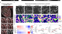 Two complementary single-stranded DNA molecules, one containing an internal Cy5 fluorophore and another containing a 5′ biotin, were annealed to form Cy5-labeled DNA constructs (Supplementary Information). On a homemade PEG-passivated and sparsely biotinylated flow channel82,83, the following reagents were flowed in order: 100 μl of T50 buffer (10 mM Tris-HCl pH 8 and 50 mM NaCl), 40 μl of 0.2 mg ml−1 Neutravidin in T50 (1-min incubation; Thermo Fisher, 31000), 100 μl of T50, 50 μl of 12.5 pM Cy5–DNA (3-min incubation), 100 μl of T50, 50 μl of 0.2 nM Cy3–GAF-DBD in imaging buffer (50 mM NaCl, 50 μg ml−1 BSA (Roche, 10711454001), 0.05% NP-40 (Sigma, I8896), 12.5 mM HEPES–KOH pH 7.6, 0.05 mM EDTA, 6.25 mM MgCl2, 5% glycerol, 0.8% w/v dextrose, 2 mM Trolox, 1 mg ml−1 glucose oxidase (Sigma-Aldrich, G2133) and 500 U per ml catalase (Sigma-Aldrich, C3155)). Note that Cy3–GAF-DBD was initially diluted to 20 nM using storage buffer (50 mM Tris pH 7.4, 300 mM NaCl, 10% glycerol and 0.05% Triton X-100) to prevent aggregation. The channel was imaged under a two-color total internal reflection fluorescence (TIRF) microscope with a 10-Hz frame rate. Laser excitation was programmed to be 10 frames of Cy5 excitation followed by 990 frames of Cy3 excitation for a 100-s video.