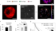 On a homemade PEG-passivated and sparsely biotinylated flow channel82,83, the following reagents were flowed in order: 100 μl of T50 buffer, 40 μl of 0.2 mg ml−1 Neutravidin in T50 (1-min incubation), 100 μl of T50, 50 μl of 50 pM Cy5–Cy7-labeled nucleosome or DNA (3-min incubation), 100 μl of T50 and 50 μl of 0.1 nM (unless stated otherwise) Cy3–GAF-DBD in imaging buffer. GAF-DBD concentrations were optimized to maximize the number of single GAF-DBD-binding events per trace while minimizing the number of more than two GAF-DBD molecules bound at the same time. The channel was imaged under a three-color TIRF microscope with a 28.6-Hz frame rate (35-ms exposure time per frame) for 601 nucleosomes with GAF motifs (Fig. 3) or a 10-Hz frame rate for hsp70p nucleosome (Fig. 4). Laser excitation was programmed to be 10 frames Cy7, 10 frames Cy5, 960 frames Cy3, 10 frames Cy7 and 10 frames Cy5.