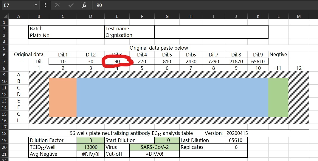 There's an error in the TCID50_SARS-CoV-2.xlsx file. The formula is missing from box E7 under Dil.3. If your dilution series differs from the standard one that's given in the spreadsheet, the dilutions will be calculated wrong resulting in an incorrect TCID50. I was able to correct the error myself by copying and pasting everything into a new spreadsheet since this one is protected and won't let you make edits outside of the green boxes. Just something to be aware of if you're using the provided spreadsheet. https://uploads.disquscdn.c...