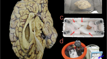 At autopsy, her fresh brain weighed 1,210 grams (normal range = 1,200 to 1,500 grams). The brain was fixed in 10% formalin 14 hours after death. Gross examination revealed a normal brain (Fig. 1), without evidence of mass lesions or cerebrovascular disease. To ensure adequate fixation and prevent specimen flattening (which can prevent specimens from fitting into custom ex vivo MRI coils), we followed a series of standard specimen processing procedures, as previously described15.