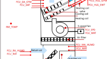 The HVACSim+ model that was used to generate the simulated dataset for multi-zone VAV AHU #2 was validated with the experimental data from the physical unit that the model was created to represent. This validation is detailed in29. To validate the model under fault-free conditions, steady state experiments and dynamic experiments were conducted to generate the experimental data for the comparison. Energy indices (i.e. electrical energy consumed by return and supply fan, heating water energy consumed by heating coil, and chilled water energy consumed by cooling coil) were used to compare the simulated energy consumption with real energy consumption during the experiment. Operational indices (i.e. temperature, air flow, and control indexes) were used to compare the simulated operational variables with the actual measurements. To illustrate, the temperature operational indices that were used for model validation are provided in Table 11. In the Table “max diff.” indicates the maximum difference of the hourly average values between simulated values and experimental data. Maximum differences less than 20% of the typical value were taken as sufficient.