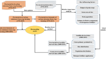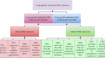 where \({E}_{i,j}^{CRLA,d}\) is direct cropland GHG emission from province i in year j; Nitri,j is the nitrogen input in the corresponding province and year, including the application of synthetic nitrogen fertilizer (NFerti,j), application of manure (Manui,j), and crop residue on cropland (RCropi,j), which were calculated through Eqs. (8) to (11); \(E{F}_{i}^{CRLA,d}\) is the direct emission factors in the corresponding province. In Eq. (8), f enn is the fraction of NH3 and NOx emissions from animals or human excreta; Amoui,j,a is the population of creature type a in the corresponding province and year; \({f}_{a}^{excr}\) is the excretion rate of manure N by corresponding creature type; \({f}_{a}^{mana}\) is the partitioning factor of excreta to anaerobic manure management systems of corresponding creature type; \({f}_{a}^{liq}\) is the partitioning factor of excreta to liquid manure management of corresponding creature type; \({f}_{a}^{sol}\) is the partitioning factor of excreta to solid storage and drylot systems of corresponding creature type. In Eq. (9), NRooti,j,s is the amount of nitrogen in crop roots of crop type s in province i in year j; NStrai,j,s is the amount of nitrogen in crop straw and stubble of corresponding crop type, province, and year; \({f}_{s}^{retu}\) is the fraction of residue (including stubble) incorporation or return of corresponding crop type. In Eqs. (10) and (11), Prodi,j,s is the crop production of crop type s in province i in year j; \({f}_{s}^{dry}\) is the fraction of dry matter of corresponding crop type; \({f}_{s}^{rb}\) is the shoot-to-root ratio of corresponding crop type; \({f}_{s}^{harv}\) is the crop harvest index of corresponding crop type; \({f}_{s}^{rbrate}\) is the nitrogen fraction in root biomass of the corresponding crop type.