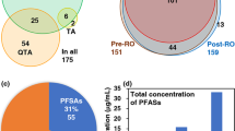 In order to estimate the approximate volume of water sampled by the HLB disk PS, 0.5 mm thick silicone sheets made of AlteSil™ (Altec, UK) with the exposed surface area of 200 cm2 were co-deployed in the DPS next to the HLB disks. Prior to exposure, the silicone sheets were spiked with 14 performance reference compounds (PRCs)35. The loss of PRCs from silicone during exposure was applied to calculate the mass transfer coefficient (MTC) of PRCs through the water boundary layer (WBL). The estimated volumes of water extracted by HLB disks are based on the assumption of the same WBL-controlled MTC in silicone and HLB disks, by the approach shown by Vrana et al.35 and were 190 and 346 L for the river exposures for 2 and 4 days, 160 and 295 L for the drinking water exposures.