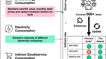 First, the FIES that is the base of the dataset used in this Data Descriptor does not cover single-person households. Single-person households are very prevalent in Japan42, and have very distinct consumption patterns, which often lead to higher per capita emissions in Japan61. This means that there is possibly an underestimation of the findings outlined in the “Technical Validation” section. Considering the comparatively high prevalence of single-person households in Japan62, there should be some caution or acknowledgement when using this dataset. It should be noted that similar to the FIES, the National Survey of Family Income and Expenditure (NSFIE)63 records the monthly consumption expenditures per household. Although the NSFIE covers a larger household sample than FIES (including single-person households), it does not record the consumption expenditures continuously. In particular the expenditures are based on a survey covering September to November for two- or more-person households, and one in November for single-person households. Furthermore, it is not conducted every year but every five years. Although this dataset has been utilized for household emissions at the city64,65, the fact remains that it has a lower periodicity and is not available publicly.