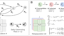 where \({i}_{j}(t)\) is the estimator of the active cases per total number of inhabitants. We then combine the \({i}_{j}(t)\) from each zone j together with a daily OD mobility matrix for the date t as follows:
