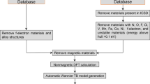 In an ideal scenario, properties i-v should have optimized values. However, these optimum values could be physically contradictory according to the usual trends defined by the chemical composition. For instance, while large SS are usually expected in compounds formed by atoms with large atomic numbers, large bandgaps tend to be found in compounds formed by atoms with small atomic numbers. This suggests that large bandgaps and large SSs are in some sense contradictory. The question arising from these apparent contradictions is: How to find the optimal candidate? This problem is also evident in other areas. For instance, the apparent contradiction between a high thermal insulation and electrical conductivity, which is desirable for thermoelectric applications. Here, we illustrate a strategy to address this problem for the specific case of compounds with SS prototypes for spintronic device applications, as shown in section Technical Validation. As we explain below, the inverse optimization process is based on Bayesian statistics using the materials’ composition and crystal structure.