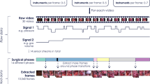 Between February 2019 and February 2021, video data from a total of 32 robot-assisted anterior rectal resections or rectal extirpations performed at the University Hospital Carl Gustav Carus Dresden was gathered and contributed to this dataset. The majority of patients (26/32) were male, the overall average age was 63 years and the mean body mass index (BMI) was 26.75 kg/m2 (Table 1). All included patients had a clinical indication for the surgical procedure. Surgeries were performed using a standard Da Vinci® Xi/X Endoscope with Camera (8 mm diameter, 30° angle, Intuitive Surgical, Item code 470057) and recorded using the CAST-System (Orpheus Medical GmbH, Frankfurt a.M., Germany). Each record was saved at a resolution of 1920 × 1080 pixels in MPEG-4 format and lasts between about two and ten hours. The local Institutional Review Board (ethics committee at the Technical University Dresden) reviewed and approved this study (approval number: BO-EK-137042018). The trial, for which this dataset was acquired, was registered on clinicaltrials.gov (trial registration ID: NCT05268432). Written informed consent to laparoscopic image data acquisition, data annotation, data analysis, and anonymized data publication was obtained from all participants. Before publication, all data was anonymized according to the general data protection regulation of the European Union.