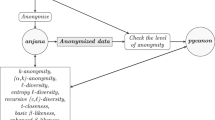 Basic β-likeness and enhanced β-likeness. These two techniques have been implemented following the definitions 2 and 3 of4, and can be used in order to control the distance between the distribution of a sensitive attribute in an equivalence class and in the entire database. In particular, be \({\mathcal{P}}=\left\{{p}_{1},\ldots ,{p}_{n}\right\}\) the distribution of a sensitive attribute S in the whole database and \({\mathcal{Q}}=\left\{{q}_{1},\ldots ,{q}_{n}\right\}\) that of an equivalence class EC. Be \(max(D({\mathcal{P}},{\mathcal{Q}}))=max\left\{D({p}_{i},{q}_{i}):{p}_{i}\in {\mathcal{P}},{q}_{i}\in {\mathcal{Q}}\wedge {p}_{i} < {q}_{i}\right\}\), then basic β-likeness is verified if \(max(D({\mathcal{P}},{\mathcal{Q}}))\le \beta \) and enhanced β-likeness is verified if \(D({p}_{i},{q}_{i})\le min\left\{\beta ,-\log ({p}_{i})\right\}\) \(\forall {q}_{i}\in {\mathcal{Q}}\). In both cases β > 0. Note that enhanced β-likeness provides more robust privacy than basic β-likeness.