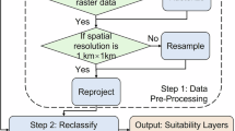 We generated our wetlands suitability data using the National Land Cover Database (NLCD)35 2019 30 m raster data. The NLCD raster was resampled to upscale the 30 m resolution to GRIDCERF’s 1 km resolution using the majority grid cell value of the finer resolution to determine the value of the coarser resolution. The data was then reclassified to set NLCD Class 90 (woody wetlands) and Class 95 (emergent herbaceous wetlands) as unsuitable. The reclassified raster was then converted to a polygon shapefile where each polygon represented wetland areas. We then used the general rasterization process described above for consistency to produce the suitability raster.