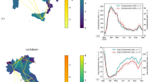 where \(| {D}_{{k}_{ij}}| \) is the number of devices that were observed to move from i to j, that is, were observed in i and their next immediate ping after at least one second was in j; and \(| {D}_{k}| \) is the cardinality of the set of unique device ids observed throughout the day Dk.