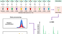 For targeted metabolomics of AA profiling in BMECs samples, multiQuant software was adopted to extract the chromatographic peak area and retention time. AA standards were used for retention time correction and metabolites identification31. Compounds having coefficient of variation under 30% cross samples were identified as reproducible measurements. For DEM identification, statistical analyses between two groups for each EAA administration (NEG vs. individual EAA treatment or POS vs. individual EAA treatment) were conducted with fold changes and P-values that were obtained according to a Student’s t test. Metabolites having P-values < 0.05 and VIP > 1 were considered as DEM.