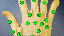 Kinematic data was recorded with motion capture technology by MoCap (Vicon, Fig. 1A.2) using 10 infrared cameras and 23 reflective markers. This system allows to retrieve joint angles starting from markers trajectories using kinematic models. The reflective markers for the motion capturing system were attached on bony eminences of the shoulder, elbow, wrist, knuckles, and phalanges, according to the Vicon Plug-in Gait model (Vicon, Oxford, UK) and RHand model (Vicon Bodybuilder models), as depicted in Fig. 1. These signals were sampled at 100 Hz. The anatomical joints’ numbers, their abbreviations, and the description of the movements are reported in Supplementary Table 3. The Vicon Nexus software was used to retrieve anatomical joint angles from the markers’ trajectories. The two Vicon models (i.e., Plug-in-Gait and RHand Bodybuilder) were used to compute the joint angles of the whole upper-arm and joints of the fingers, respectively. These Vicon models define the rigid body segments linking two consecutive markers on the body. Then, a standard inverse kinematics is applied through the Vicon Nexus software to retrieve the relative anatomical joint angles of the whole upper arm starting from the markers’ trajectories. Each of the joints enlisted in Supplementary Table 3 has the representation of the rotation around the three Cartesian axes fixed to the corresponding joint. Therefore, a hinge-joint (e.g., elbow) will have only the rotation around its principal axis and the other two rotations will be close to zero. Conversely, a ball-and-socket joint (e.g., shoulder) will have each rotation axes dedicated to a specific movement (i.e., X: flexion/extension, Y: abduction/adduction, Z: internal rotation). The RHand Bodybuilder model computes the joint angles for the right hand and fingers. As output of this model, each finger contains both absolute (Abs) and projected (Proj) angles. Specifically, the Abs angles are calculated based on single vector representations of each finger segment where it is modelled as a hinge joint. In addition, the Proj angles represent two degrees of freedom (flex/extension and ab/adduction) of the metacarpophalangeal (MCP) joint. Overall, we collected the MCP joint for all the fingers (i.e., RThumbJ2, RIndexJ1, RMiddleJ1, RRingJ1, RPinkieJ1) and the scaphotrapeziotrapezoid (STT) joint only for the thumb (i.e., RThumbJ1).