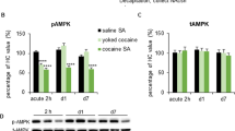 The NAc core and shell differ in their projection patterns and functions. The NAc core receives afferents predominantly from the amygdala and dorsal medial prefrontal cortex and plays an important role in cue-conditioned motivated behaviors, including drug seeking38,39,40,41. The NAc shell mainly receives afferents from the hippocampus and ventral medial prefrontal cortex and is involved in context-induced relapse to drug seeking42, 43. In the present study, we found that exposure to cocaine-associated cues induced AMPK phosphorylation in the NAc core but not shell. Furthermore, modulating AMPK activity in the NAc core but not shell altered cue-induced cocaine seeking. These results indicate that the effects of AMPK activity on the relapse to cocaine seeking were anatomically specific.