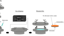 The anode electrodes were prepared by doctor-blading a slurry on pre-cleaned Cu foil with a pre-area mass loading for 0.5–0.6 mg cm−2. The slurry comprises 70% active material (gSi@C), 20% PAA binder and 10% conductive additive (carbon black). A button-type (CR 2032) half-cell configuration was used for the electrochemical measurements. Cells were assembled in an Argon-filled VAC Omni-lab glovebox with oxygen and H2O level below 0.5 ppm. Pure Li metal was used as the counter electrode for half-cell tests. Full cells were prepared and evaluated in TET USA Corporation facility with custom made LiCoO2 (lithium cobalt oxide) cathodes with a LiCoO2 mass loading of 5.3–5.5 mg cm−2. A Celgard 3501 porous PP membrane was used as the separator. The electrolyte comprising 1 M LiPF6 in fluoroethylene carbonate and dimethyl carbonate (FEC:DMC = 1:1, v/v) was used as electrolyte for half and full cells. Cycling performance and galvanostatic charge-discharge behaviors were conducted on Arbin BT300 with a voltage window ranging from 0.01 to 1.5 V (vs. Li+/Li). Capacity and C-rates were determined using 1 C = 3.6 A g−1. Cyclic voltammetry scans were tested at a fixed voltage window between 0.01 V and 1.5 V (vs. Li+/Li). Electrochemical impedance spectroscopy measurements were performed to evaluate the impedance information of gSi@C anodes on a Biologic VMPs with a frequency range between 0.01 Hz and 1 MHz.
