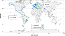 We used NicheA to assess niche similarity via the Jaccard index51 in analogous and non-analogous multidimensional environments based on components 1, 2, and 3 [ref. 48]. We also used ENMTools 1.4.3 [ref. 12] to develop background similarity tests of niche similarities in geographic dimensions. We measured the D similarity index to compare similarity between Maxent models generated using occurrences available from the native range (North America) against occurrences in the invaded range (i.e., British Islands), restricted to occurrences falling in analogous environments between European and American accessible areas. This analysis was also done across the entire (original) areas as in Di Febbraro et al.20. We compared observed similarity between the invasive population and the native range against a null distribution generated from comparisons of the invasive population and occurrence points placed at random within the native population in analogous environments12. Specific features in ENMTools were use of binary outputs from minimum-training presence, 100 replicates to build the null distribution, α = 5%, and sample sizes for background points matching available numbers of points, using the principal components (see above) to summarize environments. Additionally, we used ecospat29 to evaluate niche similarity in environmental dimensions, using the first two principal components from the original environmental variables, occurrences from native and invaded ranges with analogous environments, and identifying the 50% and 100% of environmental conditions available in each range.