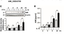 Total RNA was extracted using NucleoZOL (MACHEREY-NAGEL GmbH & Co. KG, Postfach, Düren, Germany) and reverse-transcribed to first-strand complementary DNA (cDNA) using an M-MLV cDNA Synthesis kit (Enzynomics, Daejeon, Korea). Transcription was amplified using a SimpliAmpTM Thermal Cycler (Thermo Fisher Scientific Inc. Grand Island, NY, USA) and nTaq polymerase (Enzynomics). PCR products were visualized by agarose gel electrophoresis, ethidium bromide staining, and EZ-CaptureTM II (ATTO Technology). Band intensity was measured by CS Analyzer Version 3.00 (ATTO Technology). Gene-specific primers are as follows. Pro-IL-1β (Il1b; Genebank ID: NM_008361) primers 5′-CCC AAG CAA TAC CCA AAG AA-3′ and 5′-GCT TGT GCT CTG CTT GTG AG-3′; TNFα (Tnfa; NM_013693) 5′-ACG GCA TGG ATC TCA AAG AC-3′ and 5′-GTG GGT GAG GAG CAC GTA GT-3′; IL-1α (Il1a; NM_010554) 5′-CCG ACC TCA TTT TCT TCT GG-3′ and 5′-GTG CAC CCG ACT TTG TTC TT-3′; NLRP3 (Nlrp3; NM_145827) 5′-CAG GCG AGA CCT CTG GGA AA-3′ and 5′-CCC AGC AAA CCC ATC CAC TC-3′; NLRC4 (Nlrc4; NM_001033367) 5′-ATC GTC ATC ACC GTG TGG AG-3′ and 5′-CTT CAG CAG CAG AGC CTT GA-3′; AIM2 (Aim2; NM_001013779) 5′-AGT GGC CAC GGA GAC AGA TT-3′ and 5′-GGG AGT TTC CCT GGC TCT CT-3′; Pro-Caspase-1 (Casp1; NM_009807) 5′-CTG GGA CCC TCA AGT TTT GC-3′ and 5′-GGC AGG CAG CAA ATT CTT TC-3′; GAPDH (Gapdh; NM_001289726) 5′-AAC TTT GGC ATT GTG GAA GG-3′ and 5′-ACA CAT TGG GGG TAG GAA CA-3′.